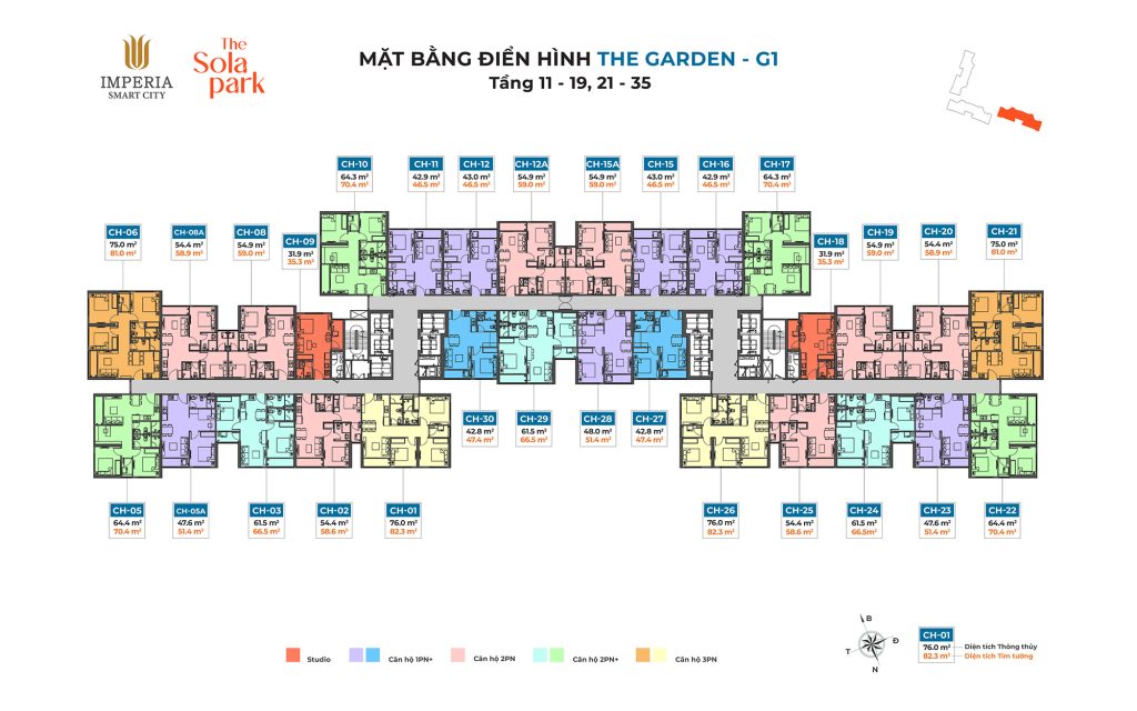 Loại hình căn hộ: studio, 1PN+1, 2PN, 2PN+1, 3PN